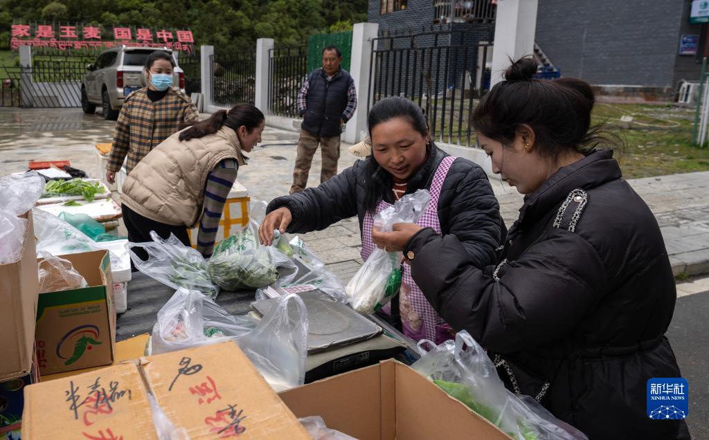 6月10日,來自隆子縣的商人肖女士(右二)向玉麥鄉的居民售賣水果和蔬菜。肖女士一個星期過來一趟。