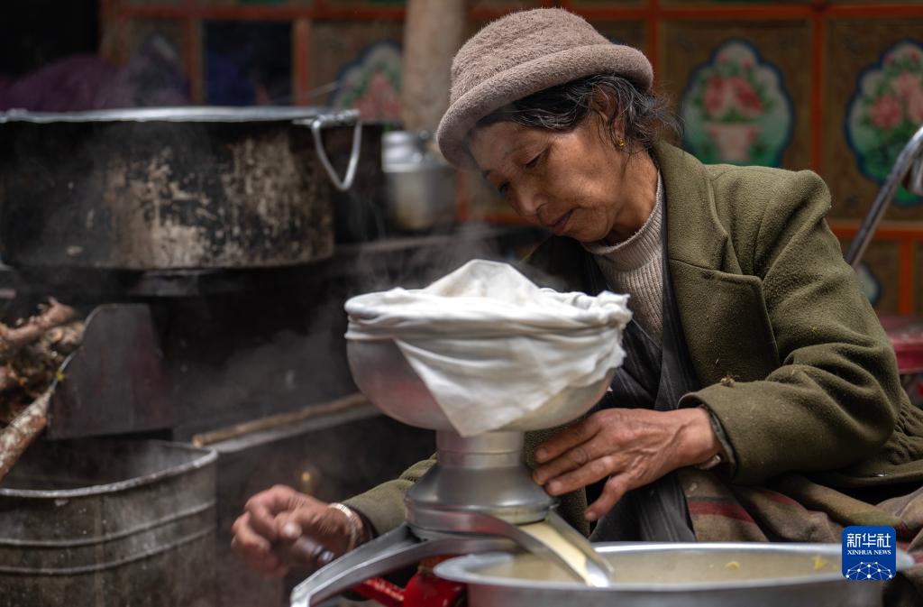 6月10日,卓嘎在牧場(chǎng)的小屋里制作酥油。