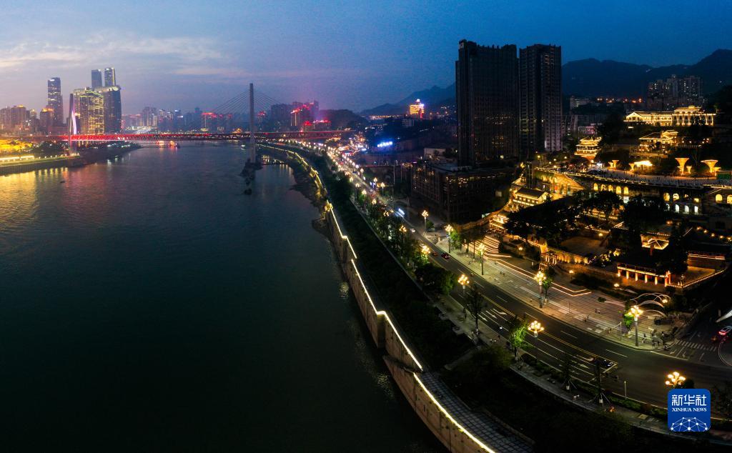 6月9日拍攝的重慶南岸區(qū)南濱路上的重慶開埠遺址公園夜景(無人機(jī)拼接照片)。