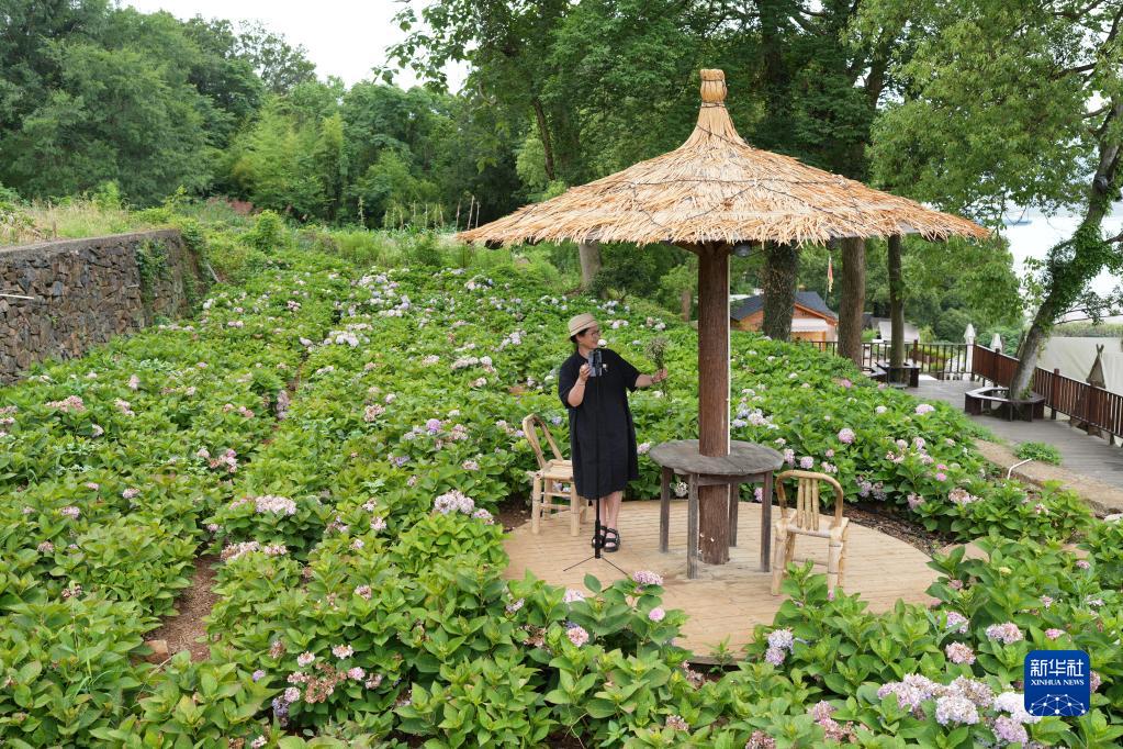 6月13日,一名女子在強(qiáng)蛟鎮(zhèn)一片繡球花間直播。