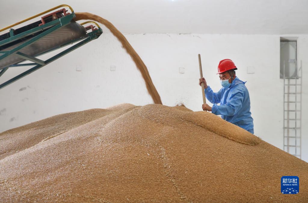 近日,江蘇連云港市全力抓好夏糧烘干收儲工作,各地倉儲中心烘干塔24小時滿負荷運轉。收獲的小麥經過篩選除雜烘干后,經過輸送帶送入糧倉。