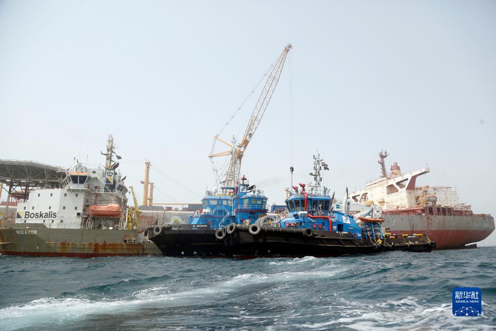 這是6月12日在也門荷臺(tái)達(dá)附近海域拍攝的聯(lián)合國工程船和“薩菲爾”號油輪。