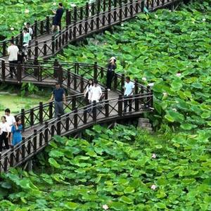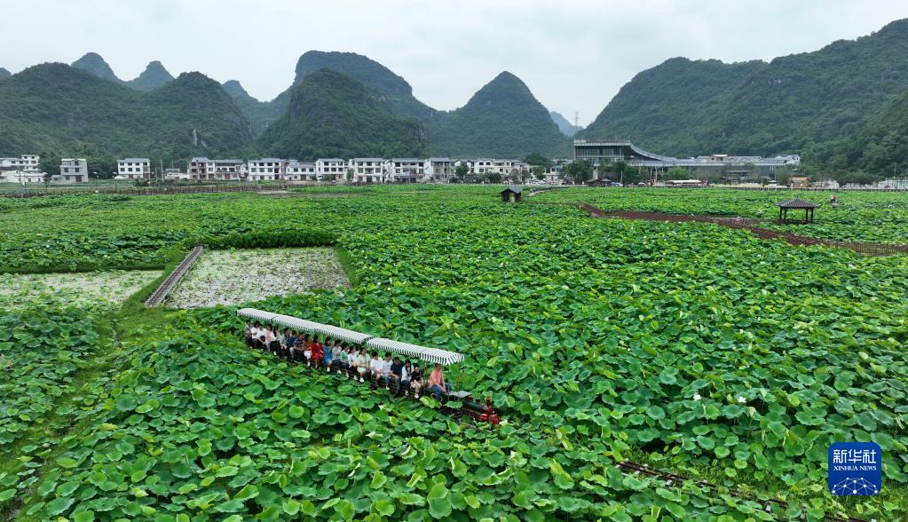 6月13日,游客在柳州市柳江區百朋鎮萬畝荷塘里游覽(無人機照片)。