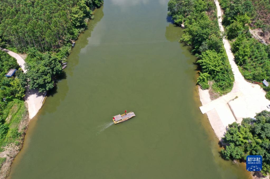 7月4日,在廣西來賓市興賓區遷江鎮大力村,李曼榮在清水河上擺渡(無人機照片)。