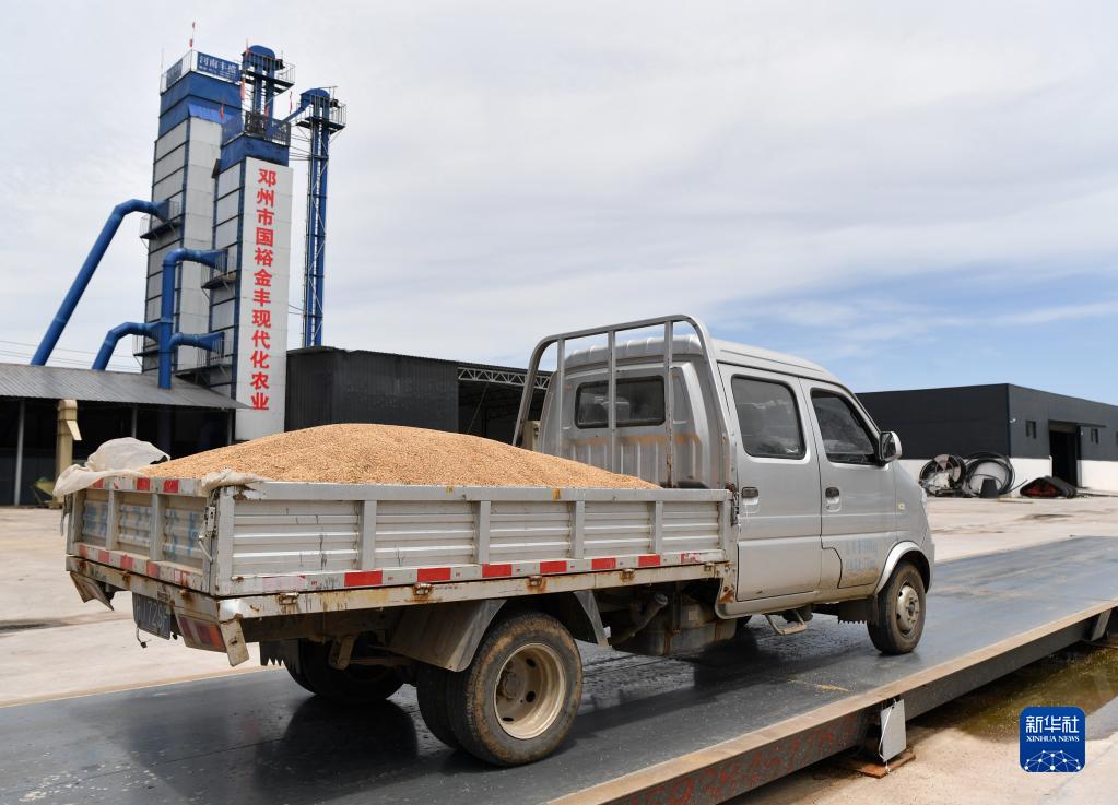 7月4日,在河南省鄧州市國裕金豐種植專業合作社,一輛運糧貨車在過磅。