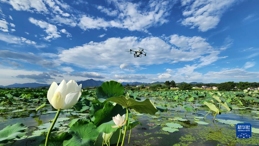 7月5日,植保無人機在湖南省常寧市板橋鎮蓮藕種植基地進行飛防作業。