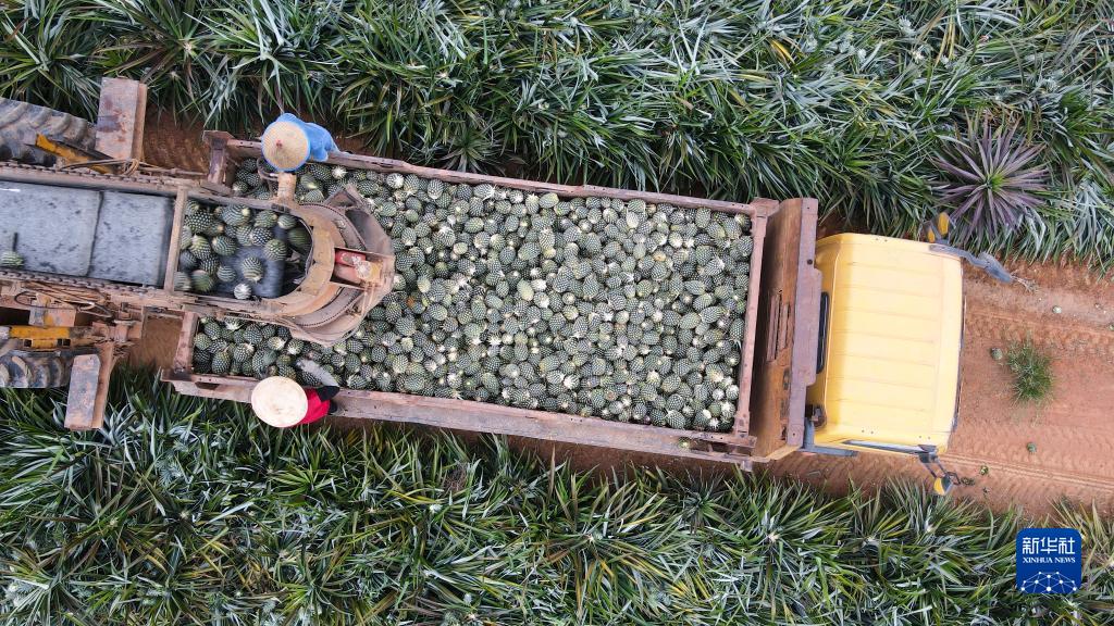 7月5日,在印度尼西亞楠榜省德邦易勿剎縣一處菠蘿種植園,人們將采摘下來的菠蘿裝車(無人機照片)。