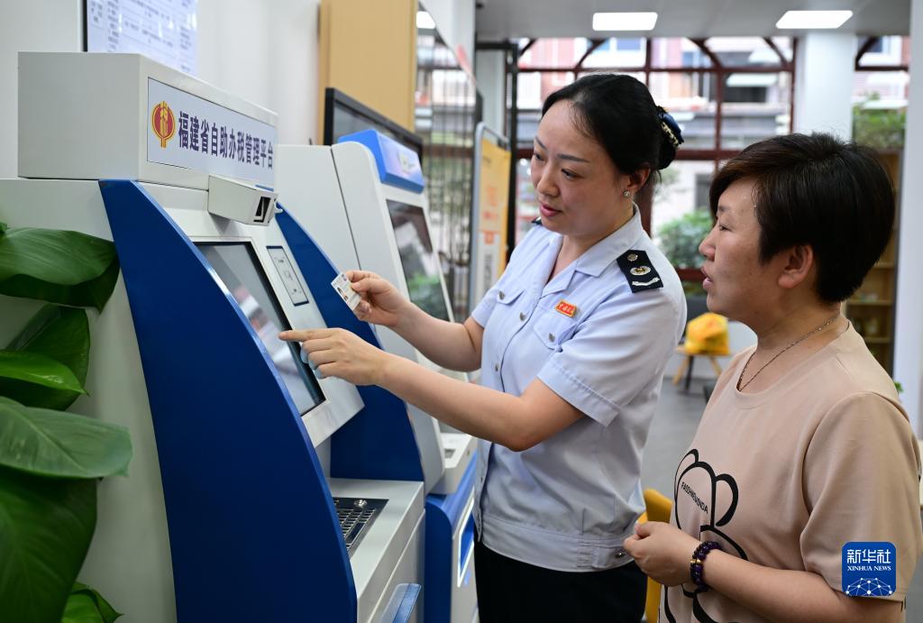 7月5日,在福州市臺江區蒼霞新城社區嘉和苑“稅銀人家”,居民唐秋冰(右)在通過驛站里的“福建省自助辦稅管理平臺”綜合一體機查詢打印個人所得稅納稅記錄。