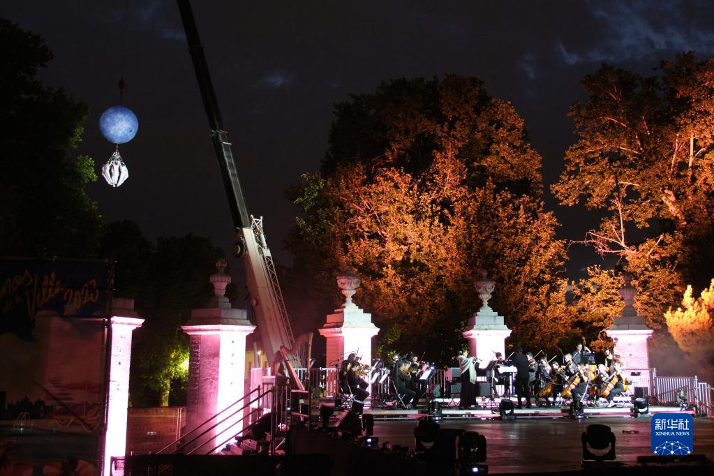 7月5日,交響樂團和舞蹈演員在西班牙馬德里“城市之夏”藝術節上一起演出“空中芭蕾”。