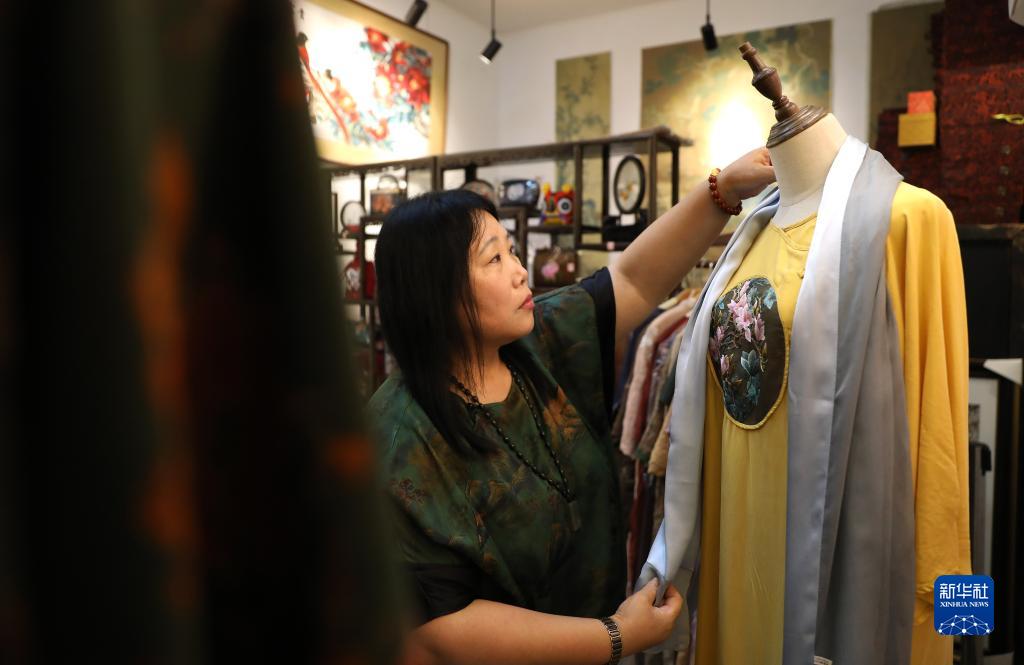 7月5日,王立君在位于遼寧省營(yíng)口市遼河老街上的工作室里為她設(shè)計(jì)的帶有滿繡圖案的民族服飾進(jìn)行搭配。