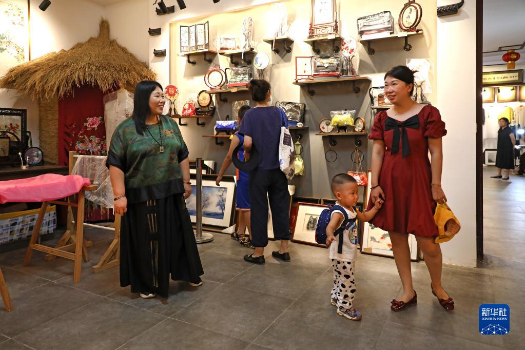 7月5日,王立君(左)在位于遼寧省營口市遼河老街上的工作室里為前來參觀的游客介紹滿繡創作。