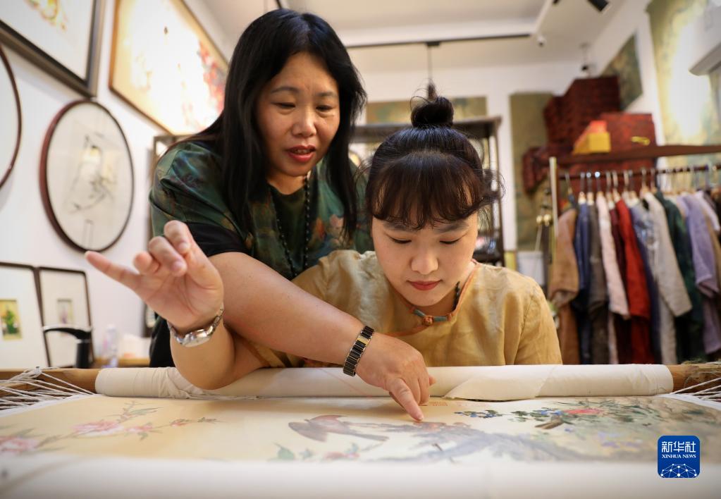 7月5日,王立君(左)在位于遼寧省營口市遼河老街上的工作室里給女兒池明明指導滿繡創作技藝。
