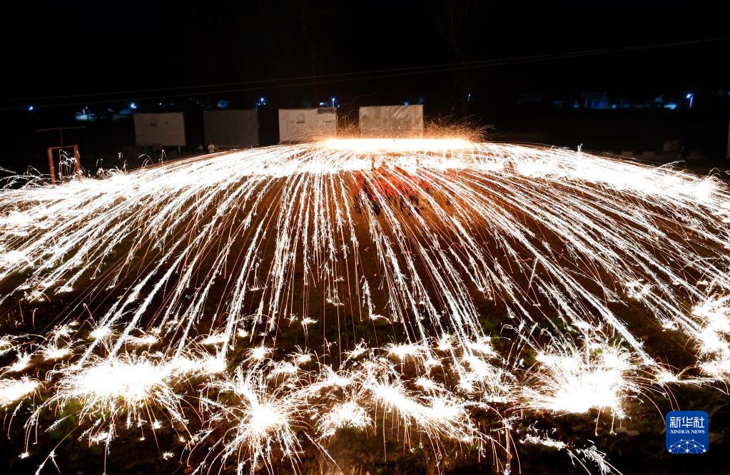 “掄花”是河北省灤平縣一項傳統民俗,已被列入國家級非物質文化遺產名錄。表演時,幾名民間藝人將木炭和碎鐵片一起放到掛在花架上的花筒中燃燒,再合力掄起花架,使花筒內升溫并向四周甩濺鐵花,形成一圈圈光線交織的光環,景象壯觀。