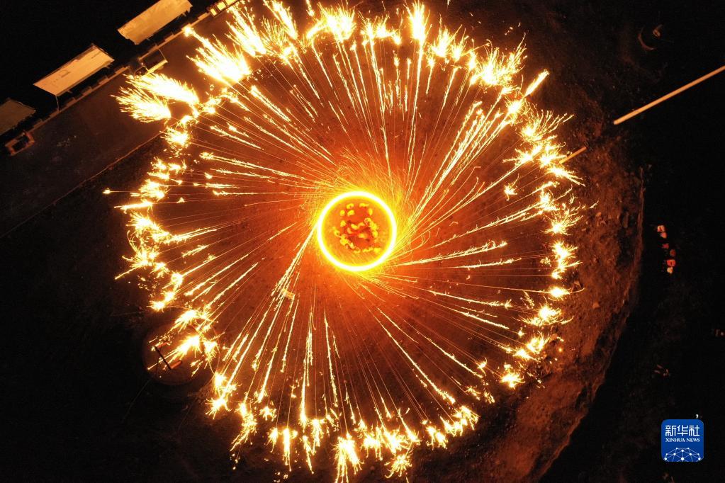 “掄花”是河北省灤平縣一項傳統民俗,已被列入國家級非物質文化遺產名錄。表演時,幾名民間藝人將木炭和碎鐵片一起放到掛在花架上的花筒中燃燒,再合力掄起花架,使花筒內升溫并向四周甩濺鐵花,形成一圈圈光線交織的光環,景象壯觀。
