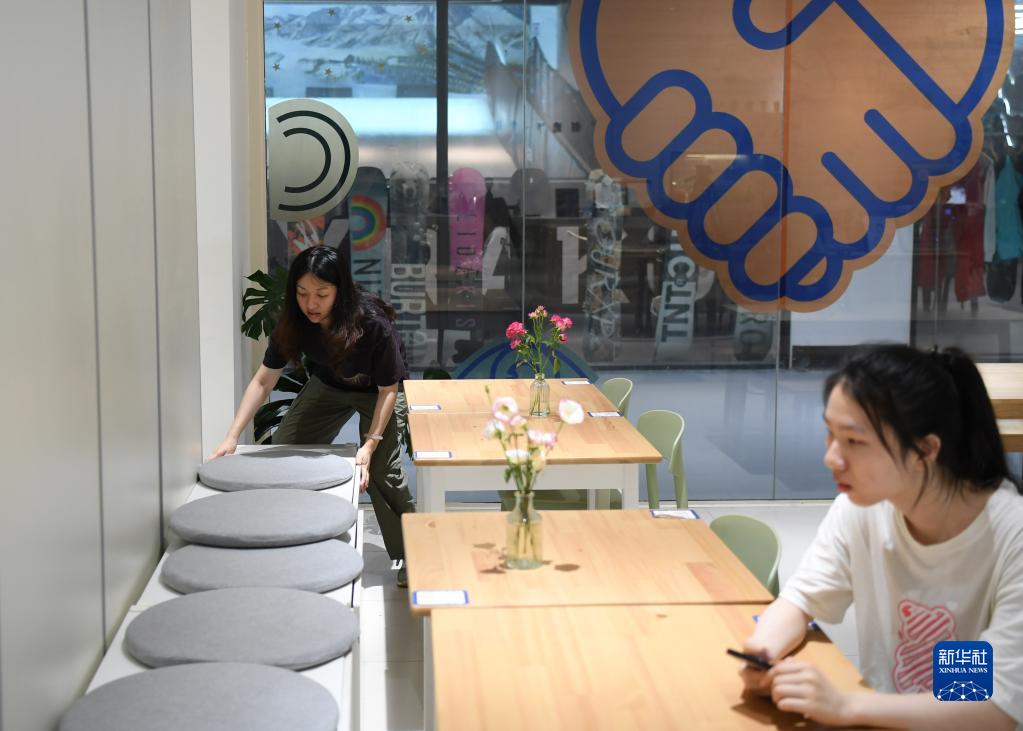 7月5日,在廣州市白云區的手心咖啡店,視障咖啡師陳柳曉(左)在整理店鋪陳設。