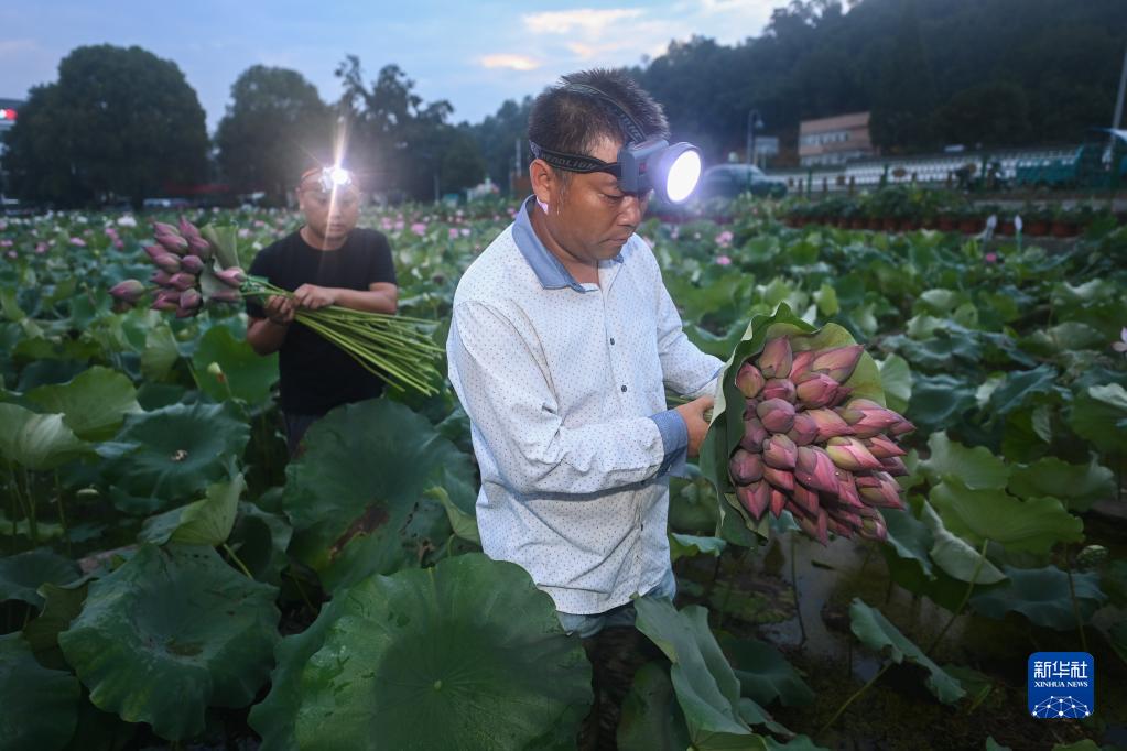 7月6日清晨,浙江省建德市大慈巖鎮里葉村村民在荷塘里摘荷花和蓮蓬。這些荷花、蓮蓬分類包裝后,將快速運往江浙滬的花卉市場。