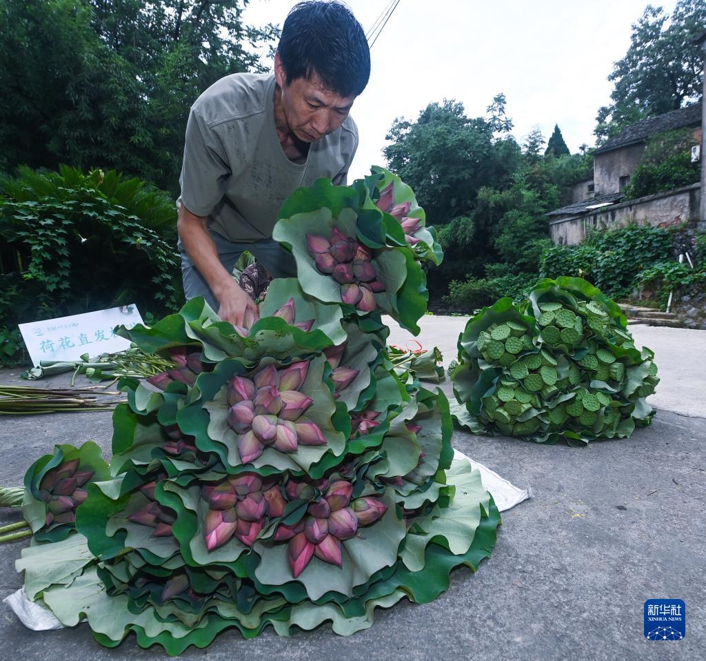 7月6日清晨,浙江省建德市大慈巖鎮(zhèn)里葉村村民在分類打包剛采摘的荷花和蓮蓬。這些荷花和蓮蓬分類包裝后,將快速運往江浙滬的花卉市場。