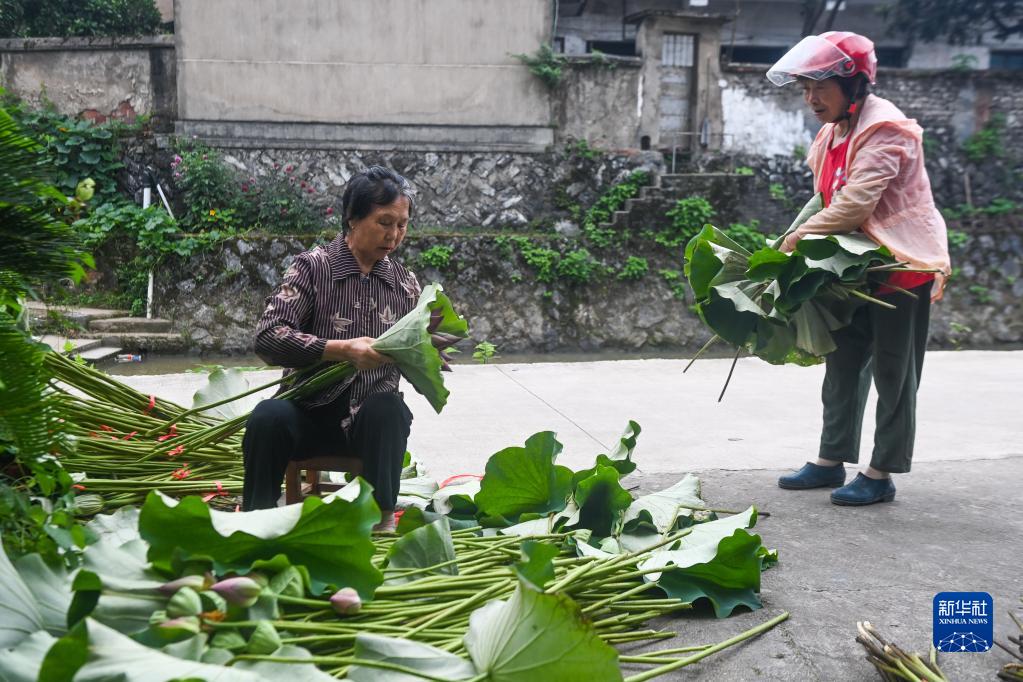 7月6日清晨,浙江省建德市大慈巖鎮里葉村村民在分類打包剛采摘的荷花和蓮蓬。這些荷花和蓮蓬分類包裝后,將快速運往江浙滬的花卉市場。