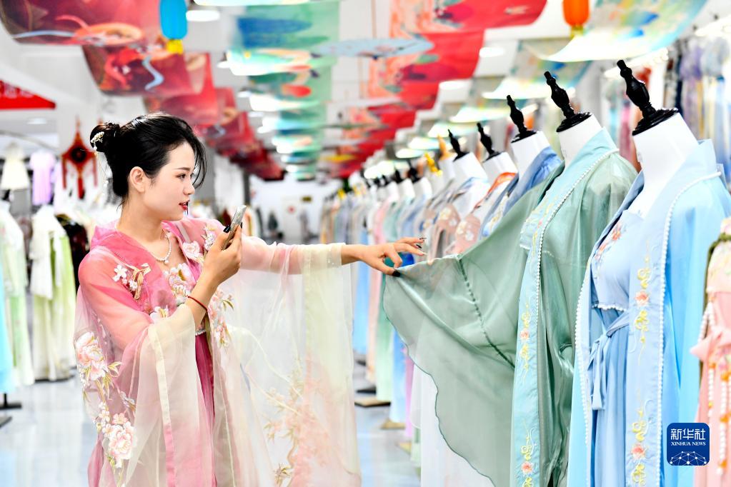 山東省曹縣依托電商資源優(yōu)勢,聚力發(fā)展?jié)h服產(chǎn)業(yè),形成了從印染、剪裁、繡花、打版、成衣全產(chǎn)業(yè)鏈條。目前,曹縣共有漢服上下游企業(yè)2100多家,并在上海、西安、洛陽等地設有漢服基地,展銷推介曹縣漢服。今年1-6月,曹縣漢服營銷收入近40億元,漢服產(chǎn)業(yè)不僅成為當?shù)厝罕娫鍪铡⑧l(xiāng)村振興的新引擎,還吸引了近兩萬名大學生返鄉(xiāng)就業(yè)、創(chuàng)業(yè)。