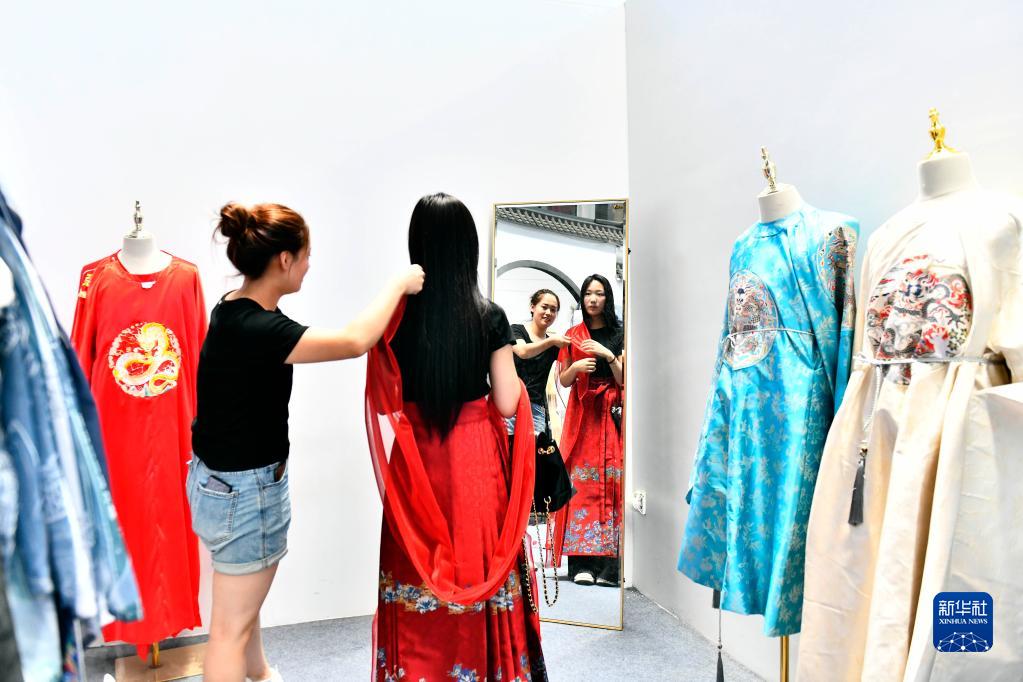 7月6日,在曹縣辰菲服飾有限公司,顧客在展廳試穿馬面裙。