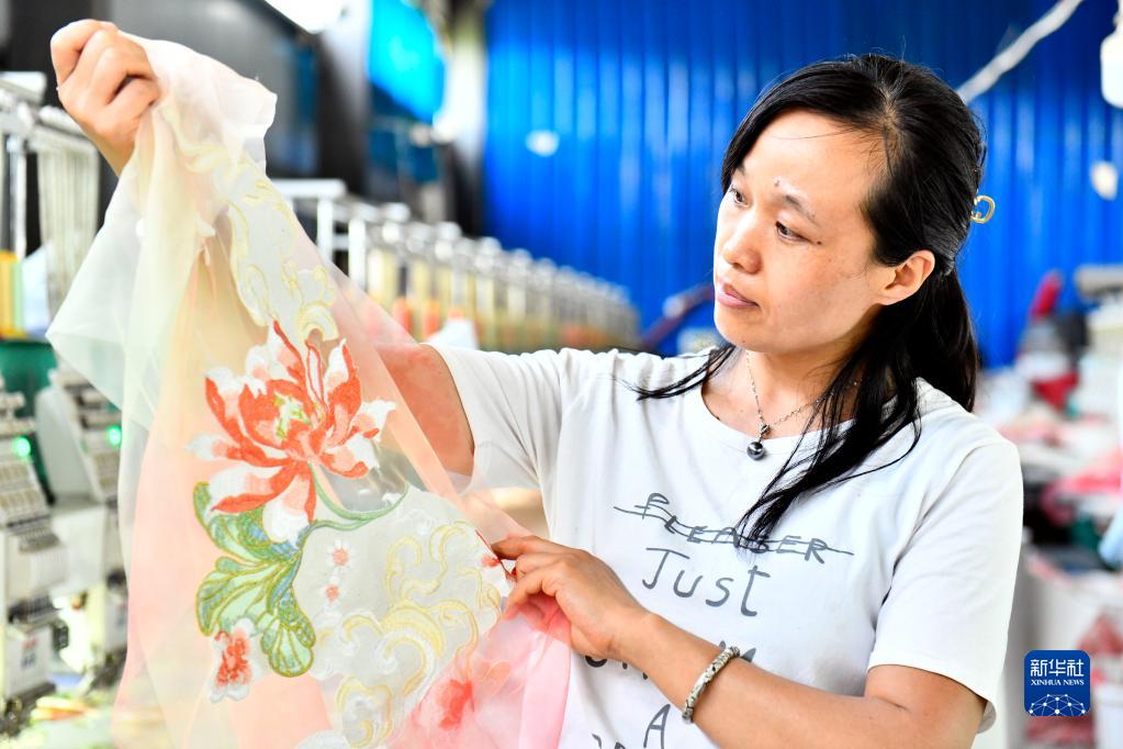 7月6日,在曹縣安蔡樓鎮李想繡花廠,工作人員在查看繡花質量。