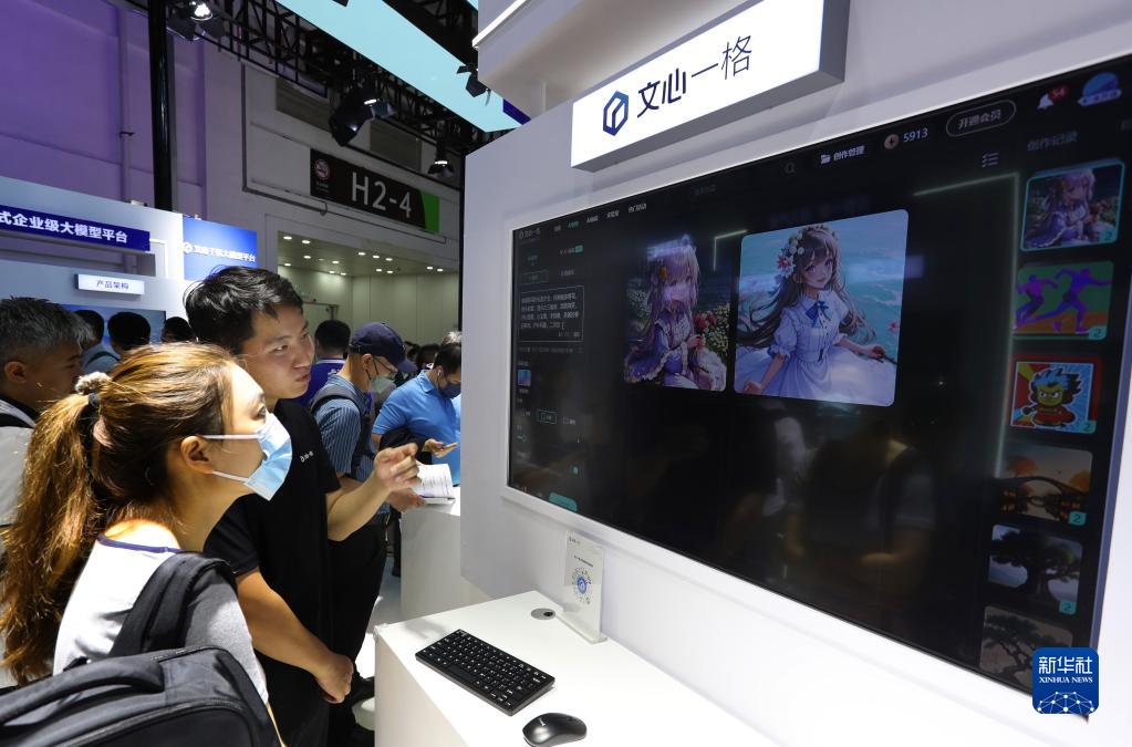 7月6日,工作人員在2023世界人工智能大會(huì)展會(huì)現(xiàn)場(chǎng)向參觀者介紹百度“文心一格”。