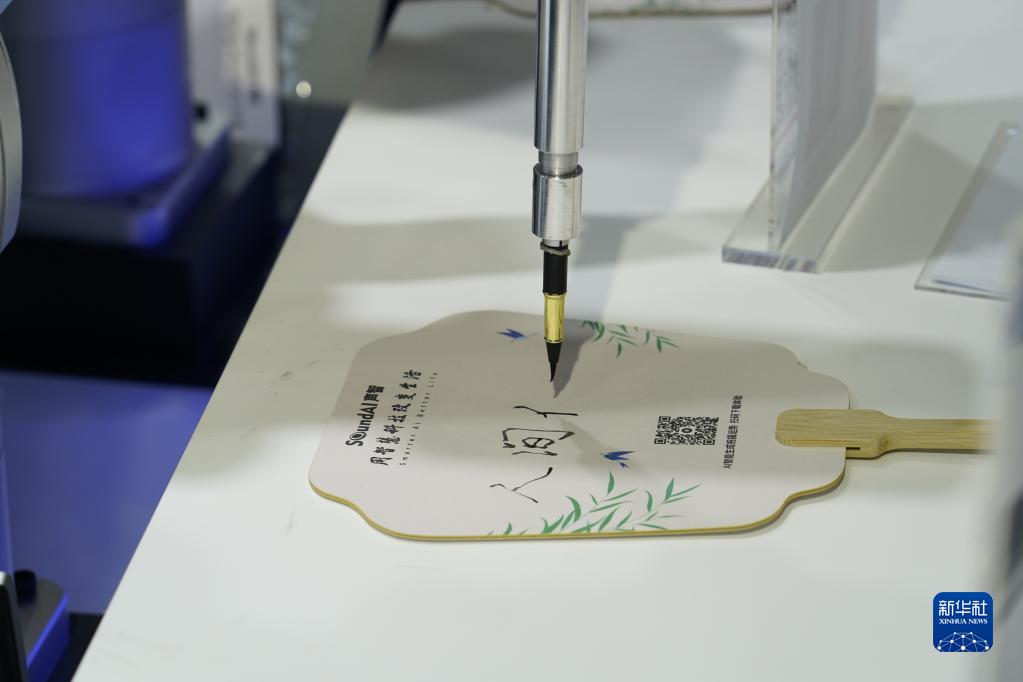 7月6日,SoundAI聲智機械手臂在2023世界人工智能大會展會現場進行團扇書法寫作。