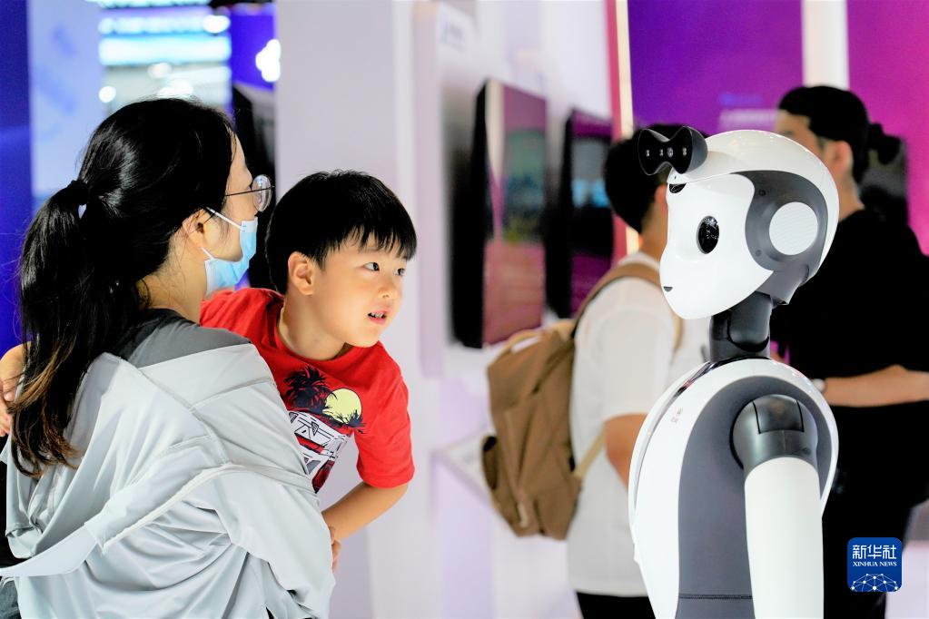 7月6日,參觀者在達(dá)闥展位與柔美人形智能服務(wù)機(jī)器人互動(dòng)。