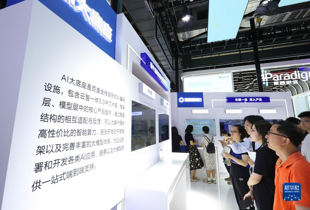 7月6日,參觀者在2023世界人工智能大會展會現場的百度“AI大底座”內容介紹展臺前駐足觀看。