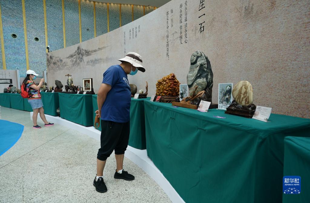 7月6日,參觀者在石博會上觀看各類奇石。