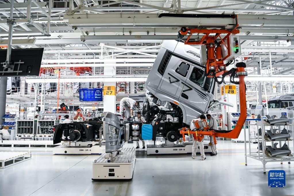 在位于吉林長春的一汽解放汽車有限公司J7智能工廠內(nèi),工人在AGV上裝配車輛(6月12日攝)。