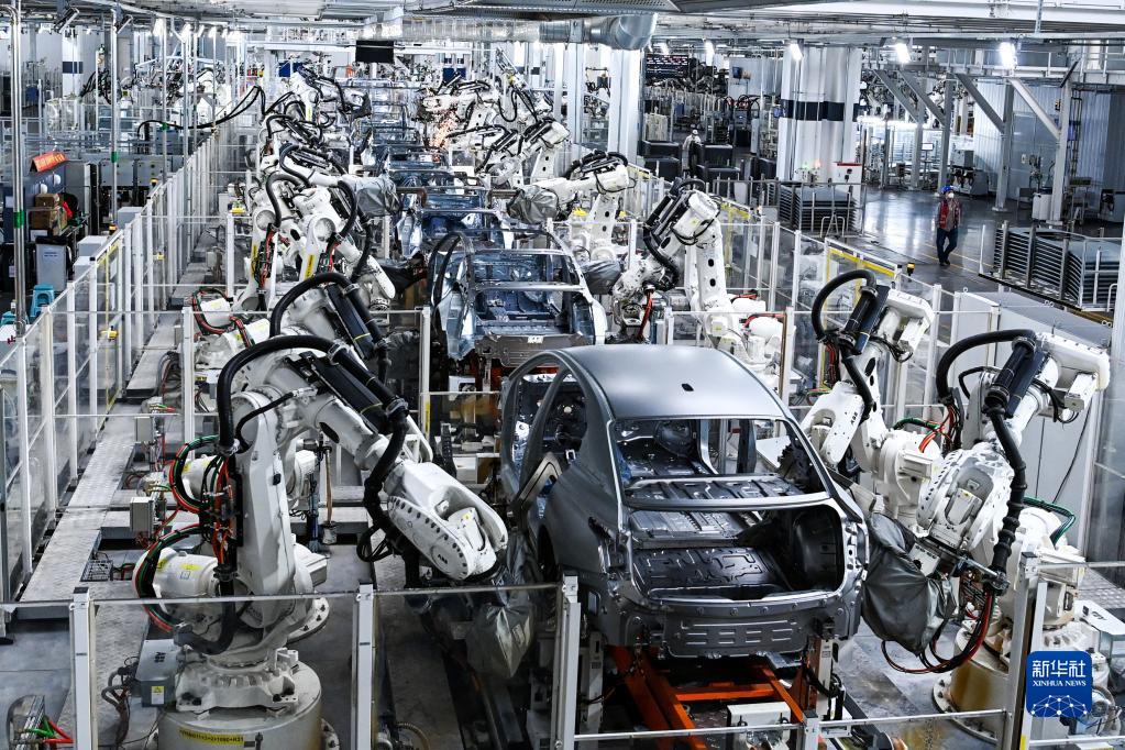 在位于吉林省長春市的一汽紅旗繁榮工廠焊裝車間內,焊裝機器人在生產線上焊接車身(2022年10月17日攝)。