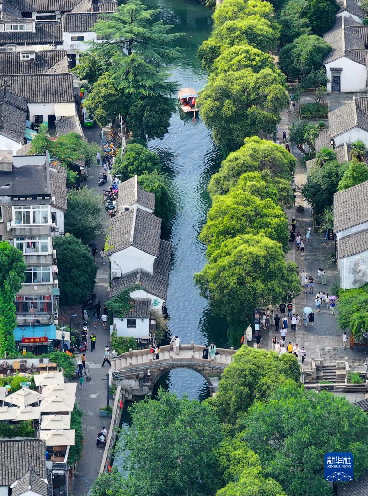 游客在蘇州平江歷史街區休閑游玩(7月3日攝,無人機照片)。