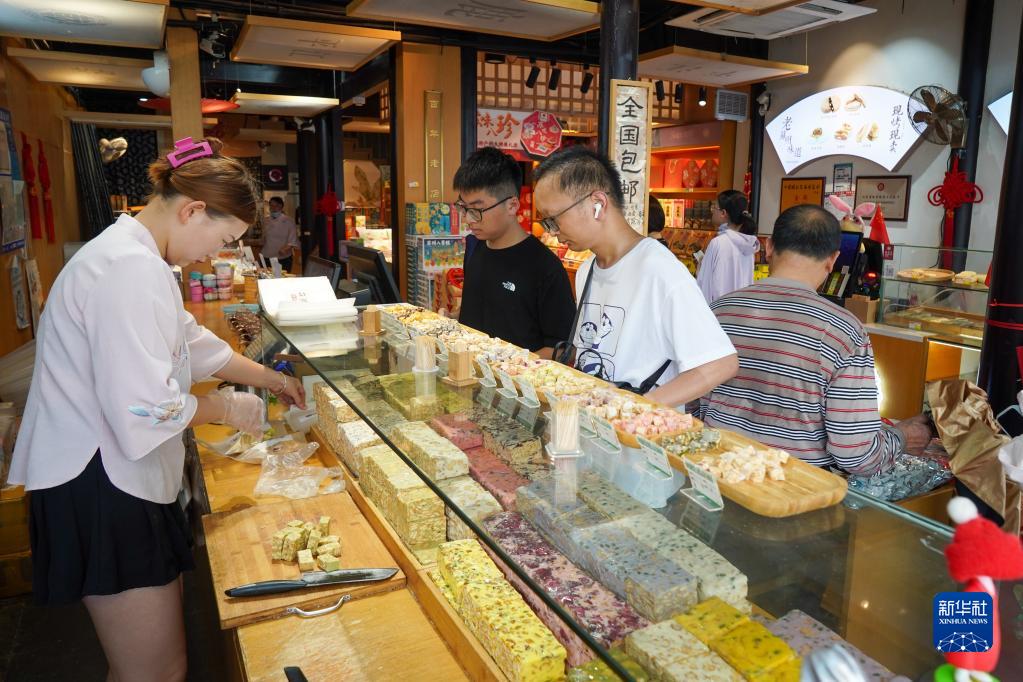 7月6日,游客在蘇州平江路一家小吃店內選購特色小吃。