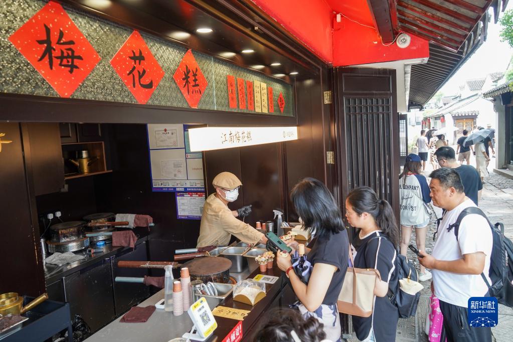 7月6日,游客在蘇州平江路一家小吃店內選購特色小吃。