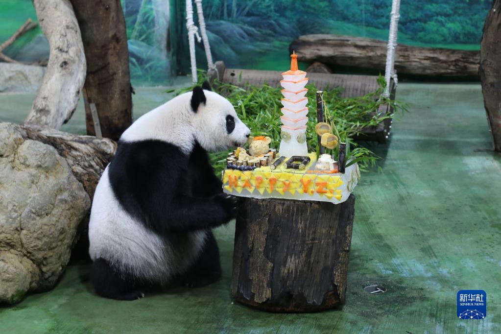 7月6日,在臺北市動物園,大熊貓“圓仔”品嘗“生日蛋糕”。