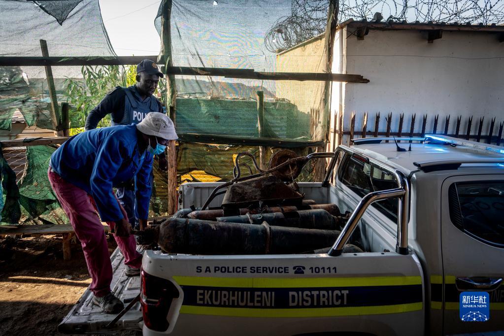 7月6日,警察在南非豪滕省埃庫爾胡萊尼市的事發現場轉移氣罐。