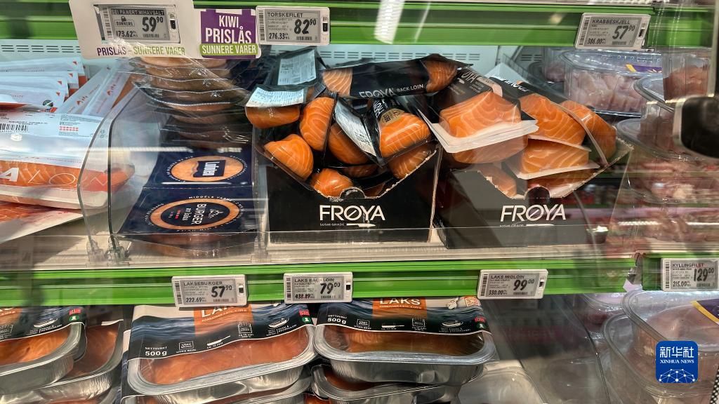 這是7月5日在挪威首都奧斯陸一家超市拍攝的三文魚等海產品。