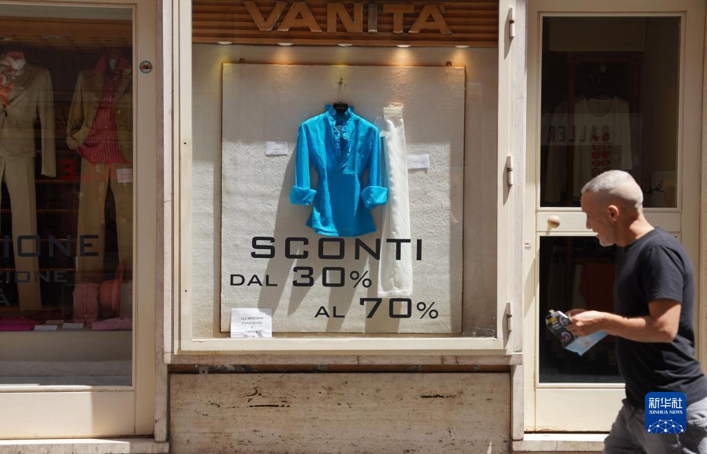 7月6日,一名男子經過意大利羅馬一處店鋪的夏季打折廣告牌。