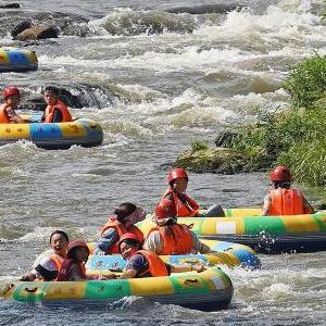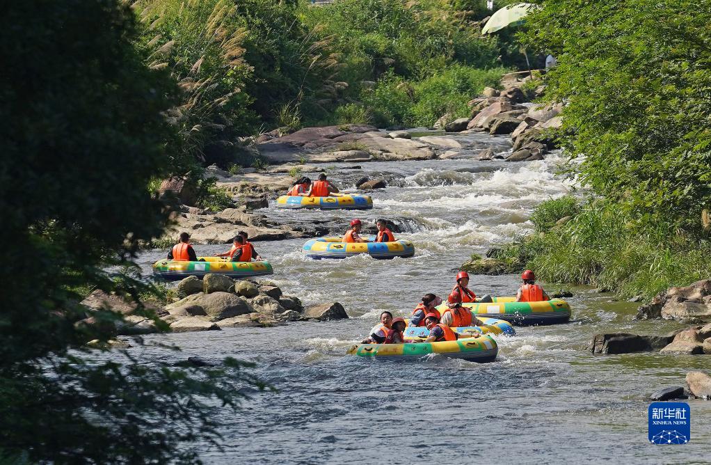江西南昌連日高溫,人們來(lái)到郊外峽谷山澗,體驗(yàn)漂流旅游項(xiàng)目,親近自然山水,享受夏日清涼。