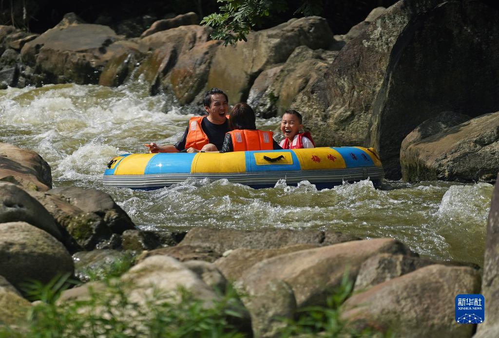 江西南昌連日高溫,人們來(lái)到郊外峽谷山澗,體驗(yàn)漂流旅游項(xiàng)目,親近自然山水,享受夏日清涼。
