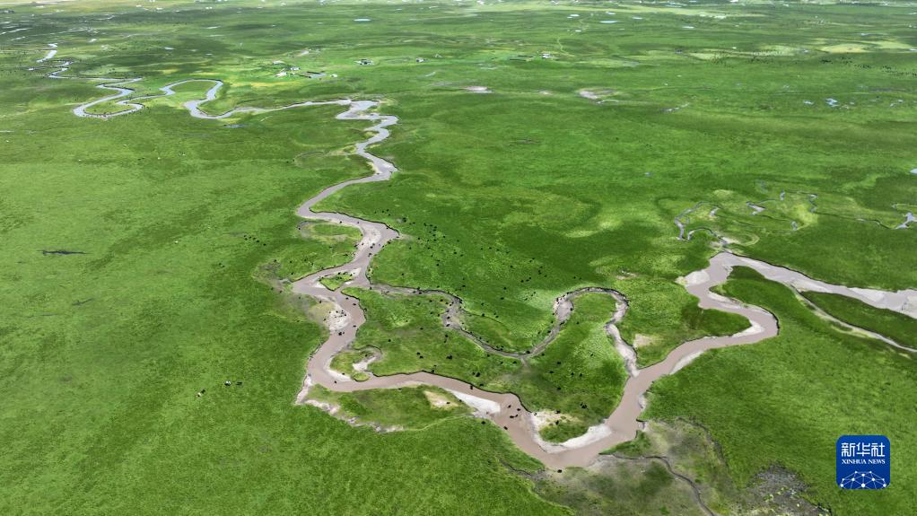 這是瑪曲縣阿萬倉濕地景色(7月6日攝,無人機照片)。