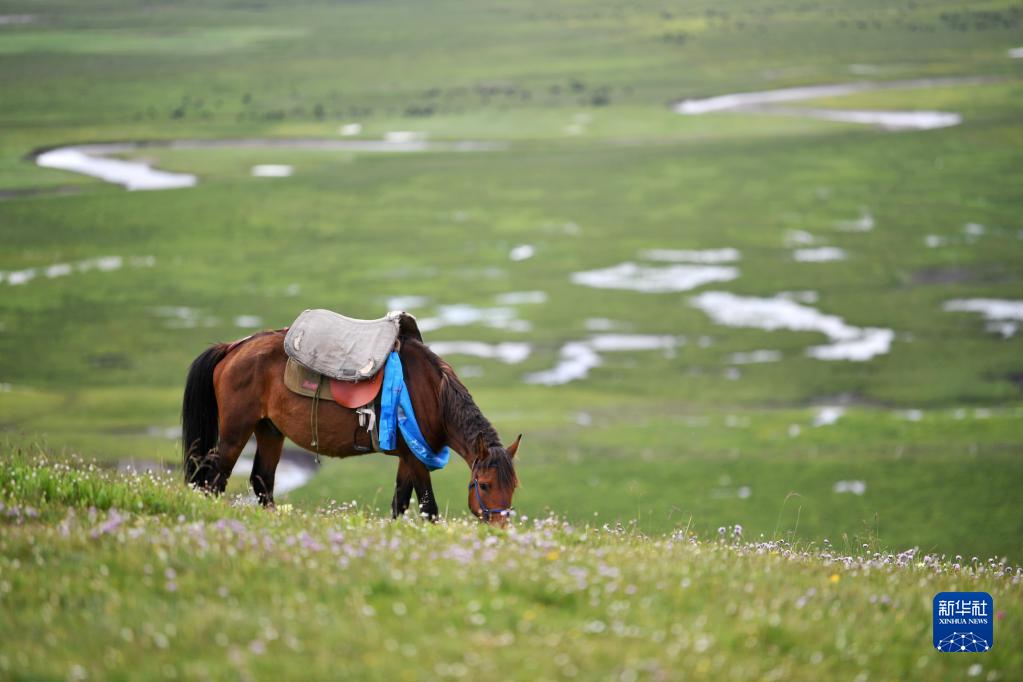 一匹馬在瑪曲縣阿萬倉濕地上吃草(7月6日攝)。
