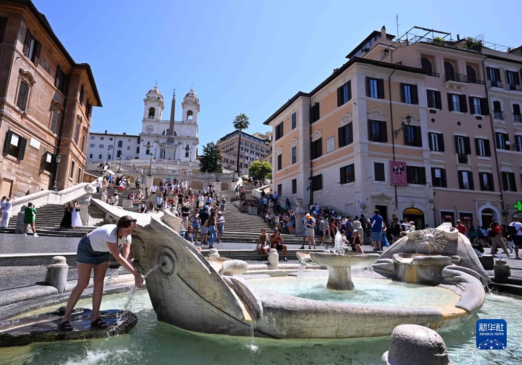 7月7日,一名游客在意大利羅馬西班牙廣場的噴泉處戲水沖涼。