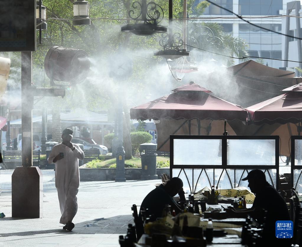 7月6日,人們走過科威特首都省一家市場的自動噴霧降溫裝置。