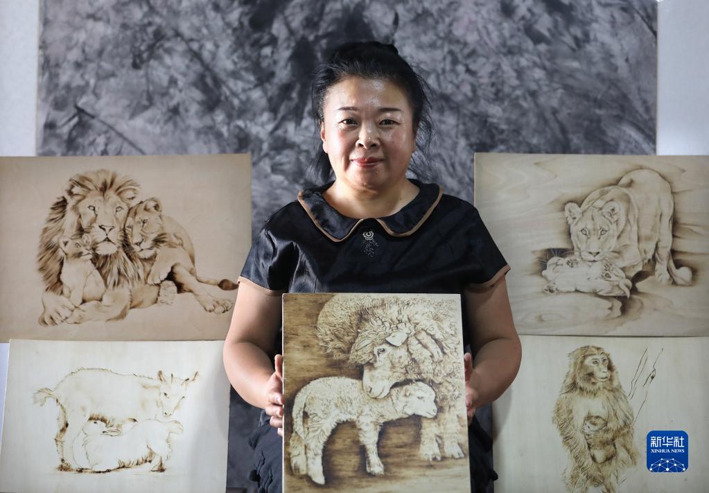 7月6日,李影在位于遼寧省營(yíng)口市大石橋的工作室里展示她的系列木板烙畫(huà)作品《動(dòng)物的母愛(ài)》。