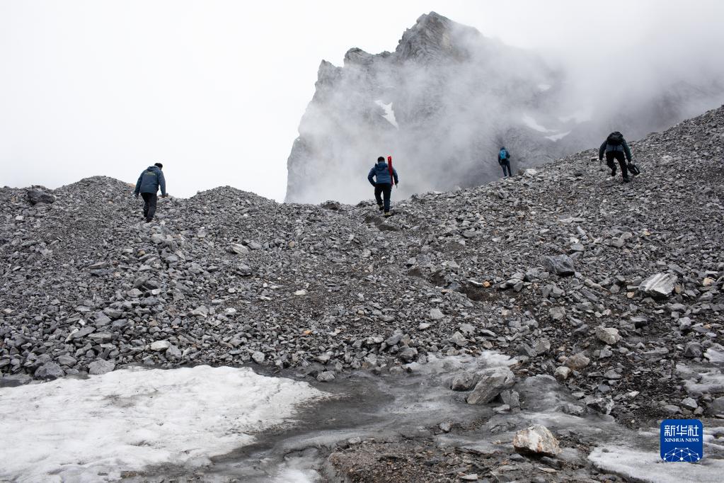 玉龍雪山站站長王世金(左一)和團隊成員攜帶監測設備前往玉龍雪山白水河1號冰川(6月19日攝)。