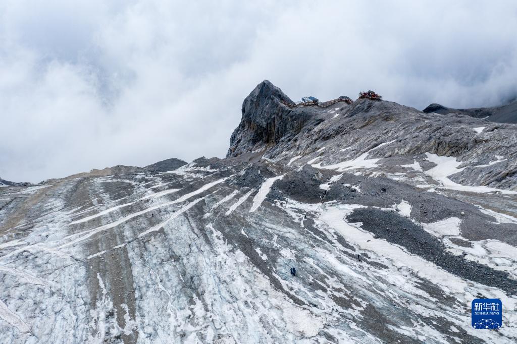 玉龍雪山站工作人員在白水河1號冰川上工作,遠處是游客棧道(6月16日攝,無人機照片)。