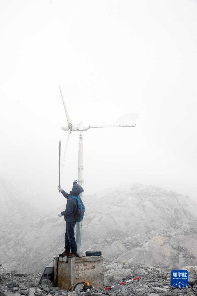 玉龍雪山站工作人員杜春紅在玉龍雪山上一處氣象觀測站點檢查設(shè)備(6月19日攝)。