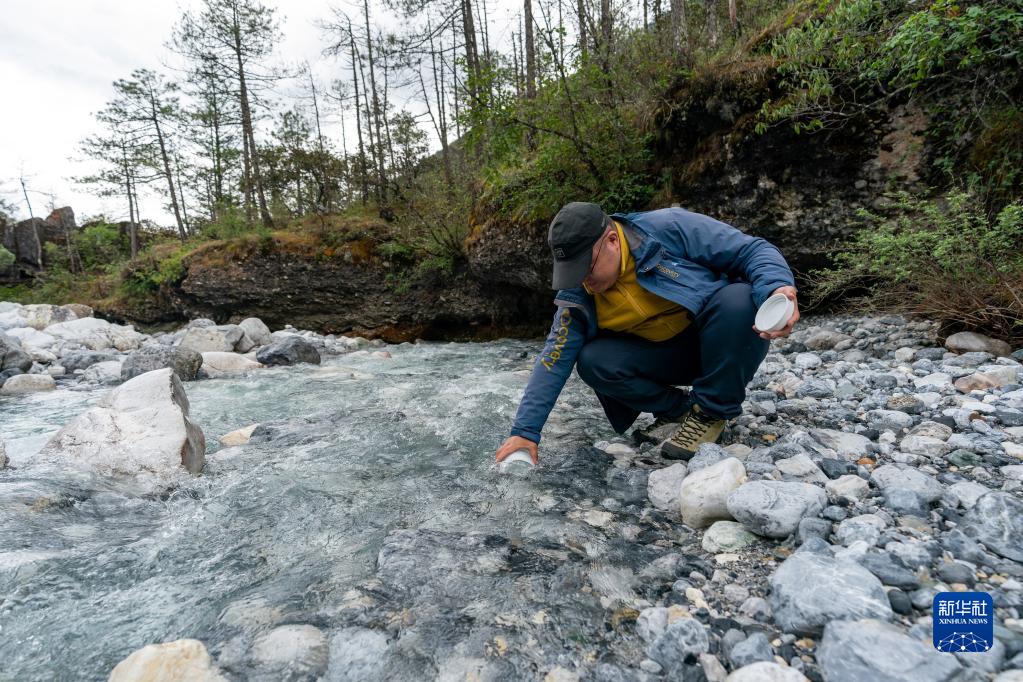 玉龍雪山站工作人員燕興國在白水河水文觀測點取水樣(6月16日攝)。